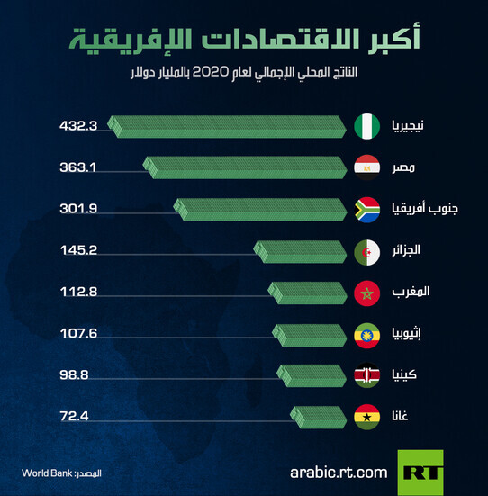 واللافت في التقرير أن تصنيف أكبر 5 اقتصادات في إفريقيا ضم 3 دول عربية، فإلى جانب مصر، جاءت الجزائر في المرتبة الرابعة باقتصاد بلغ في 2020 أكثر من 145 مليار دولار، يليها في المرتبة الخامسة المغرب، حيث بلغ حجم ناتجه المحلي الإجمالي 112.8 مليار دولار.