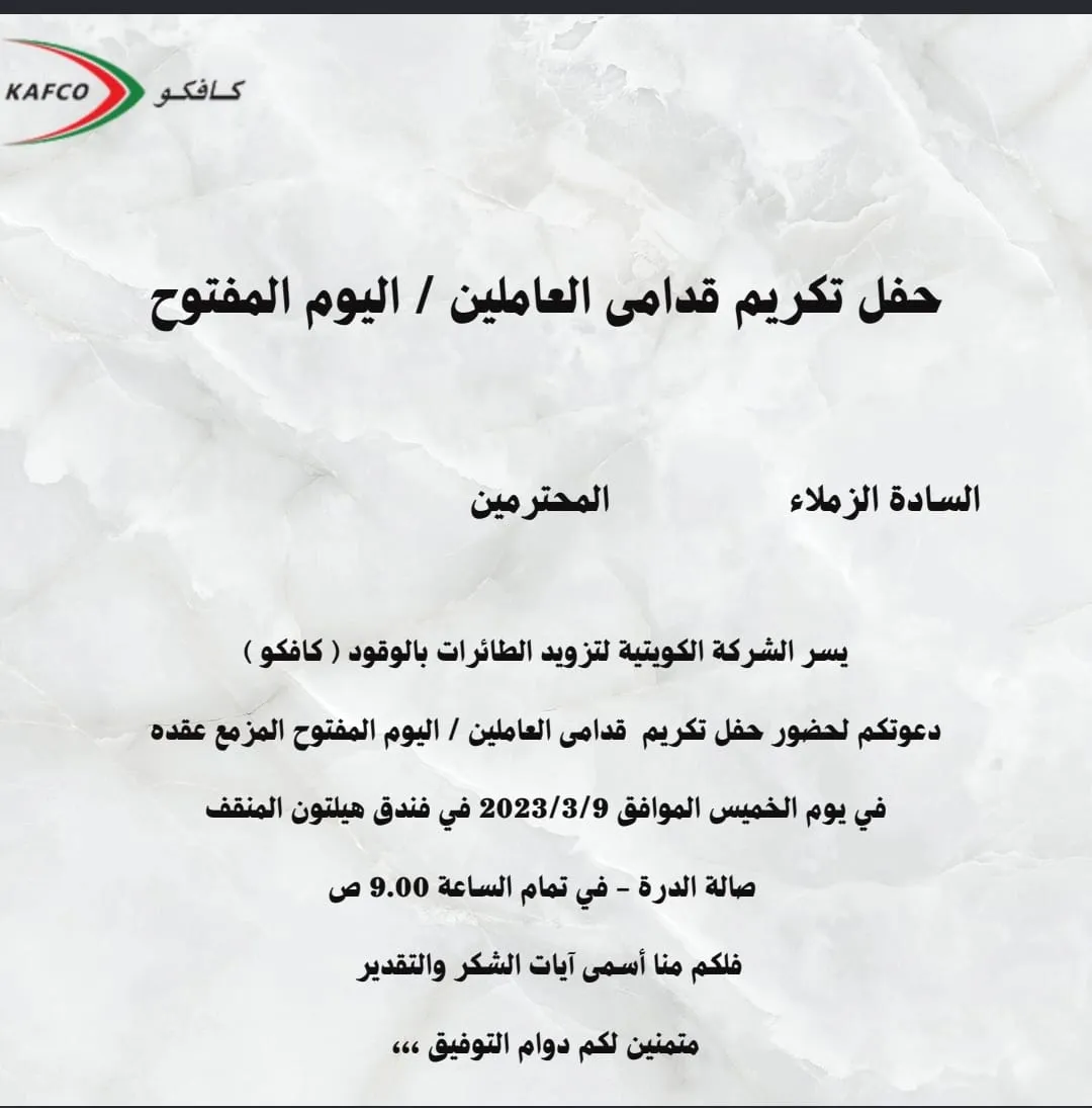 تنظم الشركة الكويتية لتزويد الطائرات بالوقود ” كافكو ” ، حفل تكريم قدامي العاملين – اليوم المفتوح المزمع عقده في يوم الخميس 9 – 3 – 20 23 في فندق هيلتون المنقف بصالة الدرة في تمام الساعة التاسعة صباحًا.