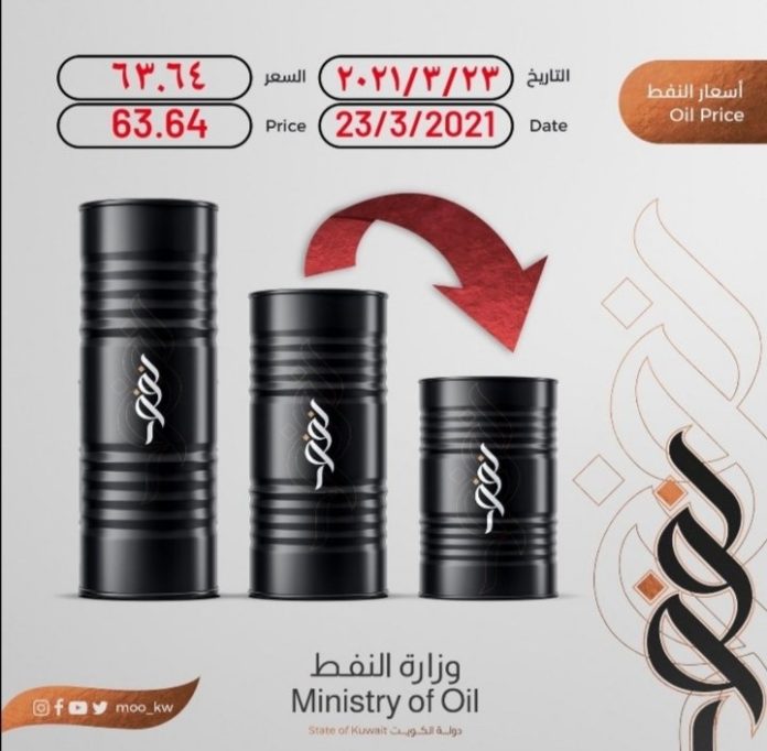 تراجعت أسعار النفط الكويتي بواقع 23 سنتاً، لتبلغ في تداولات أمس 63.64 دولاراً للبرميل، مقابل 63.87 دولاراً للبرميل في تداولات اليوم السابق، وفقاً للأسعار المعلنة من مؤسسة البترول الكويتية.