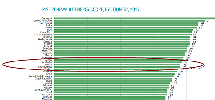 احتلت تونس المرتبة 21 عالميا في مجال الطاقات المتجدّدة خلال سنة 2017 من مجموع 133 بلدا بعد أن كانت في المرتبة 65 خلال سنة 2016 وذلك وفق التقرير الصادر عن البنك العالمي حول وضعيّة السياسات العموميّة في مجال الطاقة المستدامة.