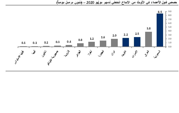وزادت حصة خام الأوبك من إجمالي الإنتاج العالمي بمقدار 70 نقطة أساس لتصل إلى نسبة 26.1 في المائة في يوليو 2020.