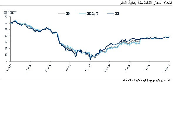وصلت أسعار عقود النفط الفورية إلى أعلى مستويتها المسجلة في 5 أشهر مقتربة من 45 دولار أمريكي للبرميل بعد المكاسب المتواضعة التي استمرت في اضافتها منذ منتصف يونيو 2020 بدعم من تحسن توقعات الطلب والانتعاش الاقتصادي في كافة انحاء العالم. وجاء هذا النمو أيضاً على خلفية انخفاض إنتاج النفط الصخري في الولايات المتحدة.